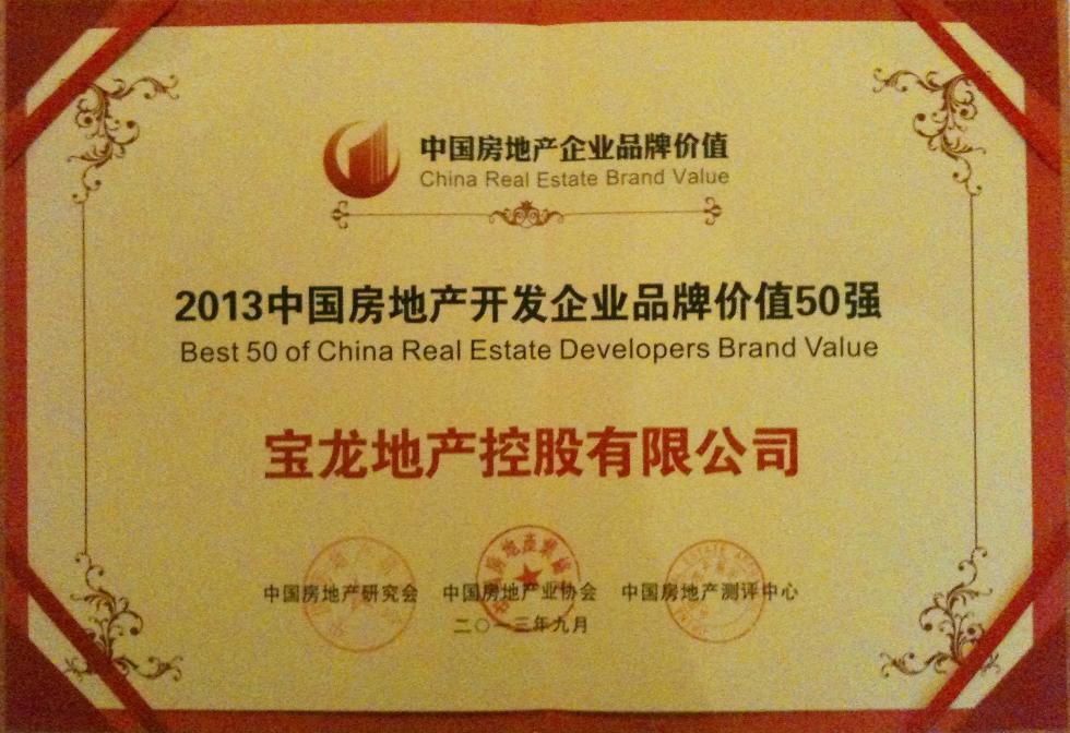 上海2013年9月18日電 /美通社/ -- 2013年9月17日下午,由中國房地產研究會、中國房地產業協會、中國房地產測評中心聯合主辦的“2013中國房地產品牌價值測評成果發布會暨房地產品牌發展高峰論壇”在北京舉行。寶龍地產(HK.1238)獲得2013中國房地產開發企業品牌價值50強(第36名)、中國商業地產企業品牌價值10強(第2名)和中國房地產企業較佳雇主品牌30強(第26名)三項大獎。測評結果顯示,寶龍地產的品牌價值達46.84億,較去年增長5.26億元。