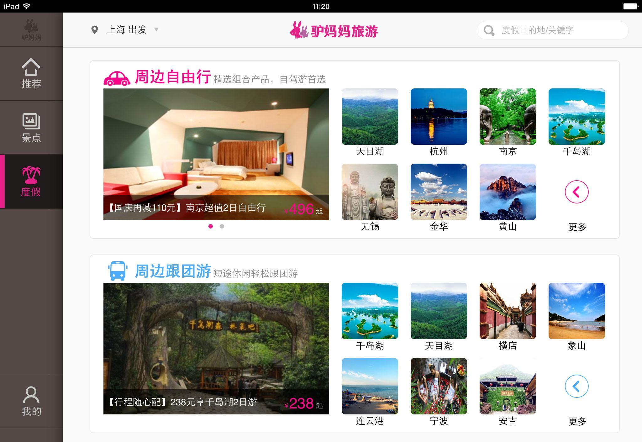 全新驢媽媽iPad版客戶端提供了基于門票、周邊自由行、周邊跟團游、長途游、出境游等多種類型產品的訂購服務。為方便用戶查找出游目的地,客戶端還開發了超實用的目的地搜索功能,用戶可通過頻道頁面右上方點選“景點/目的地”、“度假/目的地”,根據各自出游目的地搜索到相關產品進行預訂。