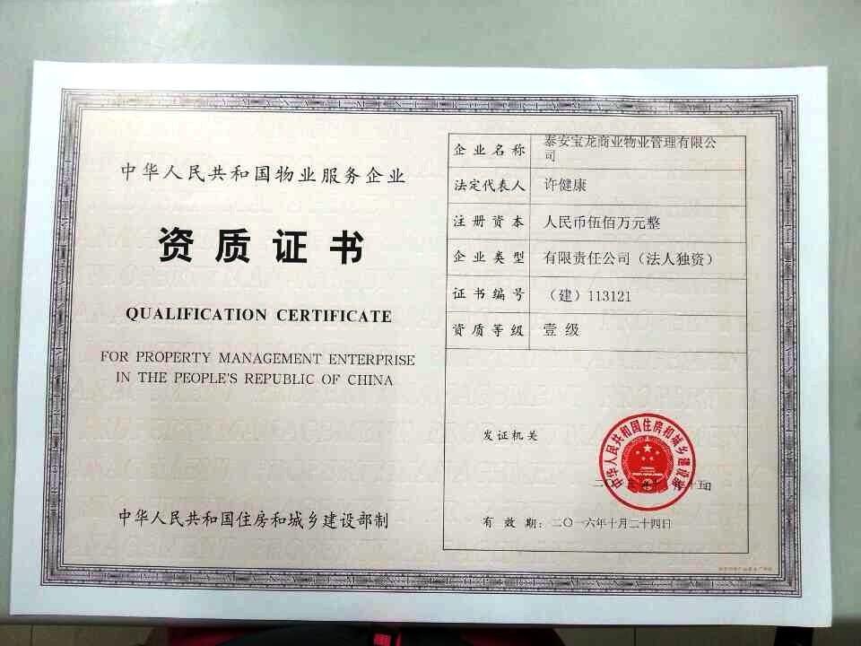 上海2013年11月1日電 /美通社/ -- 2013年10月31日,寶龍集團旗下的泰安寶龍商業(yè)物業(yè)管理有限公司正式收到由國家住房和城鄉(xiāng)建設部頒發(fā)的國家一級物業(yè)服務企業(yè)資質(zhì)證書,成功晉升物業(yè)管理國家一級資質(zhì)物業(yè)服務企業(yè),標志著寶龍物業(yè)服務已經(jīng)得到了行業(yè)主管部門和市場的廣泛認可,為濟身于全國先進物業(yè)管理企業(yè)行列、在市場運作和項目發(fā)展方面奠定了堅實的基礎。