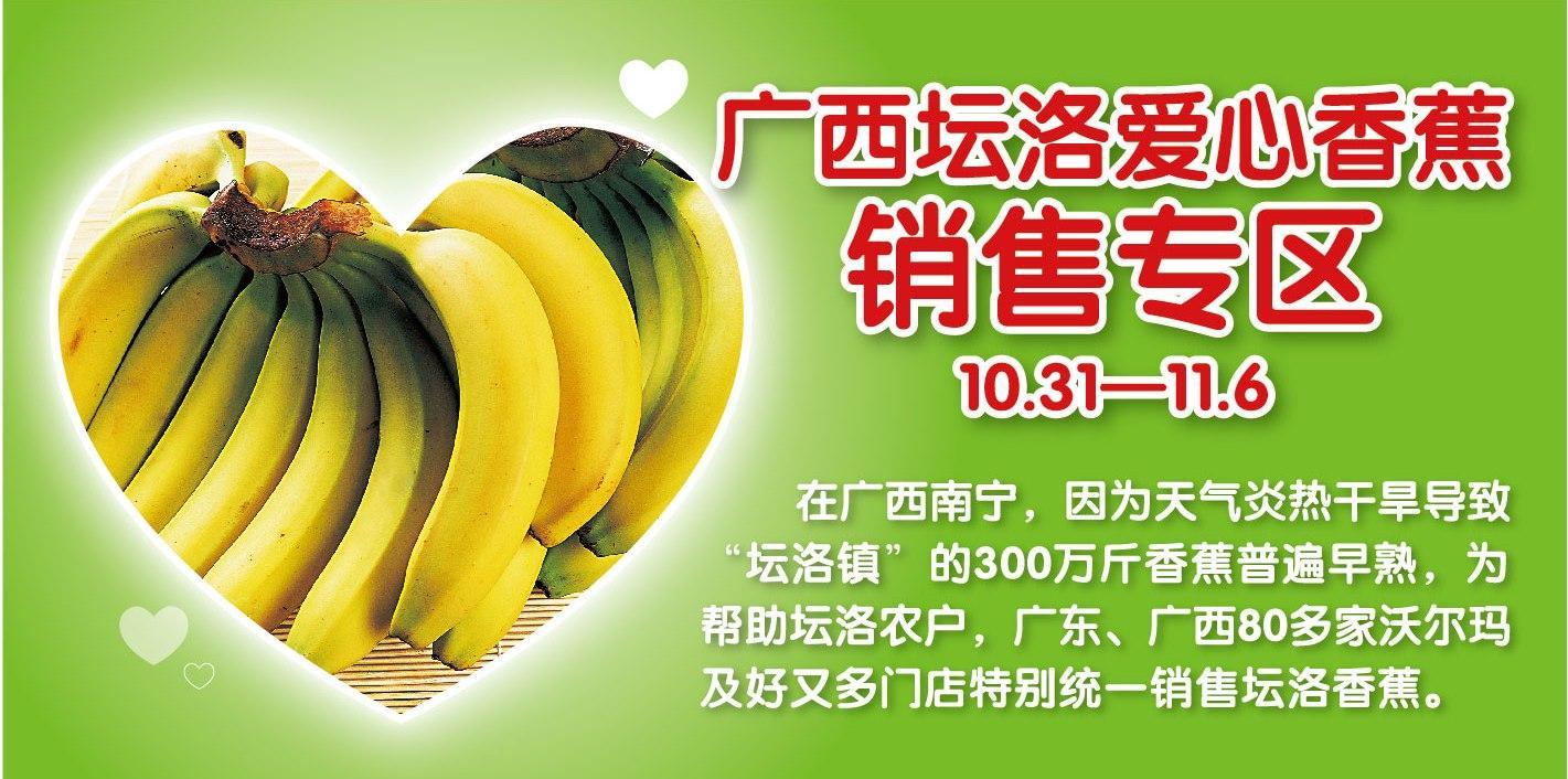中國南寧2013年11月4日電 /美通社/ -- 因天氣炎熱干旱,廣西南寧壇洛鎮的300萬斤香蕉普遍早熟,使上市高峰提前來到,熟蕉賤賣卻仍無人問津,蕉農損失慘重。沃爾瑪得知情況后,迅速與香蕉商會對接,收購近8.5噸香蕉。10月31日起到11月6日,廣東、廣西80多家門店統一銷售愛心香蕉,幫助壇洛農戶解決燃眉之急。