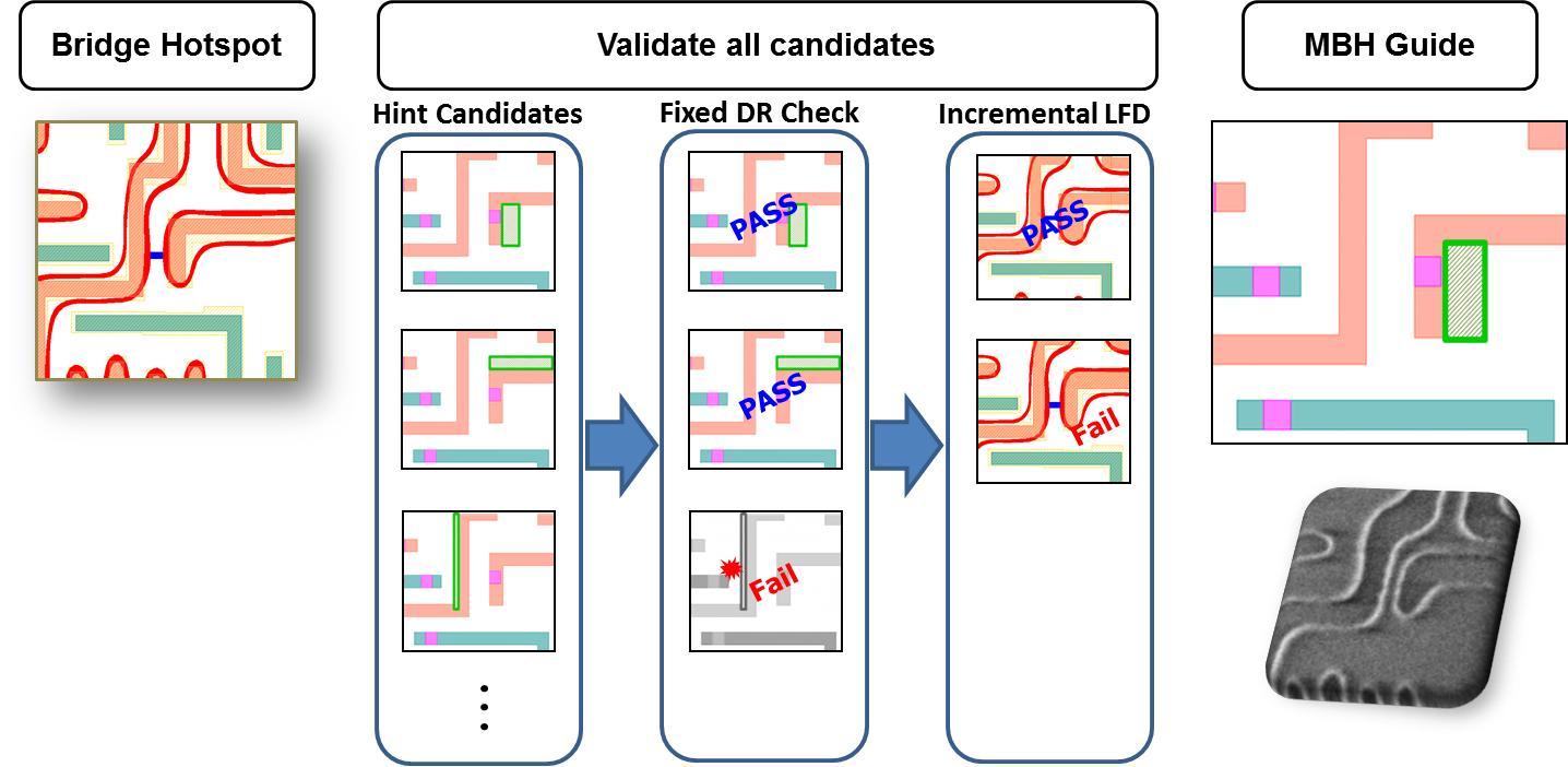 不過,移動布局邊緣來修復光刻熱點,這些邊緣不一定是直接鄰接熱點。確定移動哪個布局邊緣來修復光刻熱點的過程相當復雜,因為從設計布局到印出電路涉及一連串改變原始布局形狀的復雜非線性步驟(如 RET),原本布局圖型改變及光學效應對布局特征的影響需列入考慮。鑒于修復光刻熱點所需的布局修正必須由設計人員進行,他們通常不熟悉這些流片后過程,顯然在修復過程中,電子設計自動化 (EDA) 工具需要為設計人員提供一些幫助。