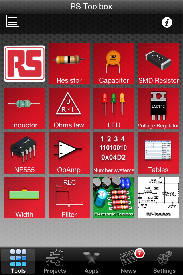 RS Toolbox 提供一系列廣泛的功能,均以圖標(biāo)形式在主屏幕上分組呈現(xiàn),包括多種工程計(jì)算器、轉(zhuǎn)換器和查詢表。例如RLC濾波計(jì)算器,555定時(shí)配置器,用于各種穩(wěn)壓器和運(yùn)算放大器的計(jì)算器,以及諸如編號(hào)系統(tǒng)轉(zhuǎn)換器和歐姆定律計(jì)算器等基本工具,還有包括電池類型與尺寸、電纜顏色編碼、封裝尺寸和螺線管規(guī)格等內(nèi)容的查詢表。