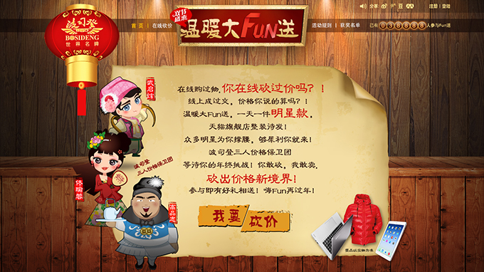 本次活動(dòng)采用全新的“在線砍價(jià)”互動(dòng)模式,詼諧幽默的店小二更是見招拆招迎戰(zhàn)參與挑戰(zhàn)的砍價(jià)高手,性格迥異的店小二哪個(gè)才是你的菜呢?不妨試試看,你的價(jià)格你做主,買到羽絨服才靠譜!情商極高的店小二還會(huì)對(duì)你的砍價(jià)招數(shù)做出搞笑評(píng)價(jià),將其分享還能參加驚喜環(huán)節(jié),大獎(jiǎng)逐級(jí)遞增。2013年12月16日,波司登“溫暖大Fun送”,開門迎來八方客,“砍價(jià)神人”在民間。