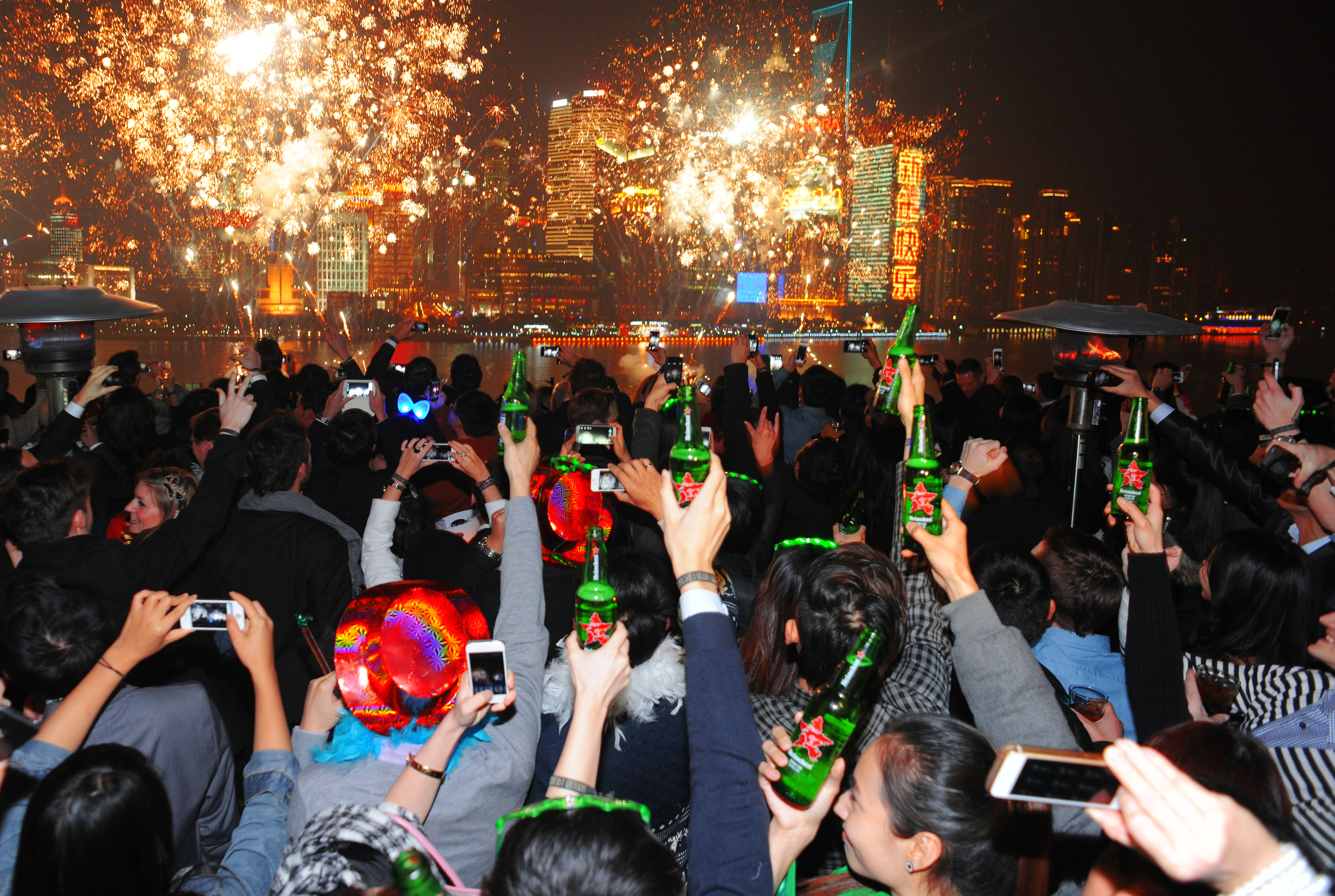 倒計時之夜,來自全球各地的人們歡聚外灘共同慶祝2014年的到來。在黃浦江畔萬人的見證下,這些祝福隆重呈現在上海最具地標性的震旦廣場巨幅屏幕上。這塊被吉尼斯世界紀錄評為“世界第一大彩色電子屏幕”,播放了喜力傾情制作長達30分鐘的新年短片,與祝福一起分享給全球跨年的人們,攜手大家一起叩開2014新年的大門。